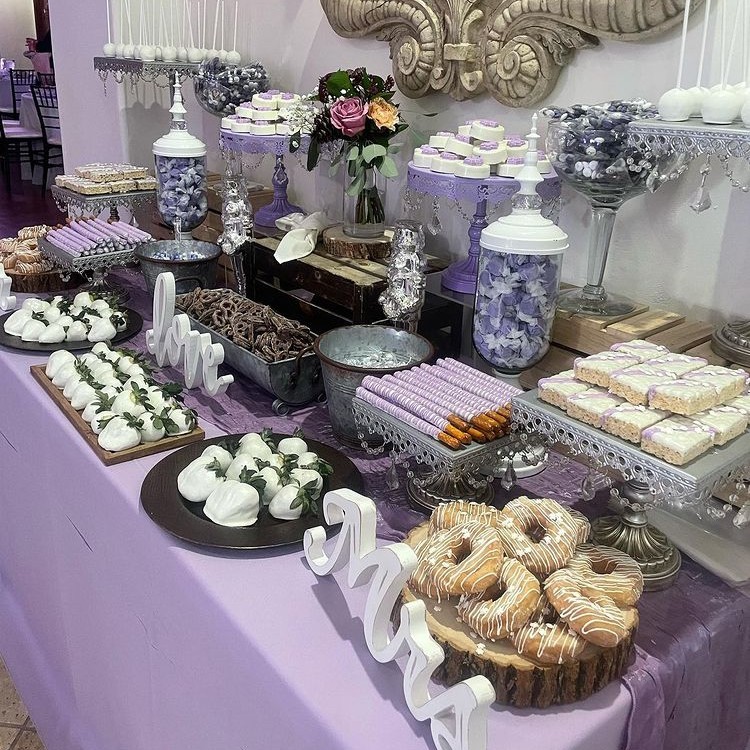A full, luxurious candy display designed to impress. Styled with height variation, color blocking, coordinated décor, and professional layout. Perfect for weddings, corporate events, mitzvahs, and milestone parties.