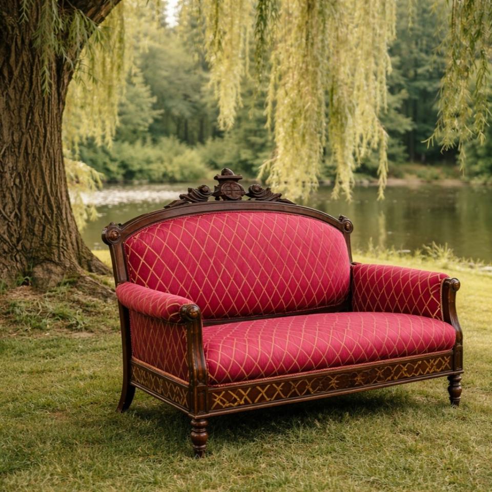 Its structured silhouette and elevated arm height create a regal profile while remaining intimate enough for two. The contrast of rich red and antique wood tones photographs beautifully in both indoor candlelight and outdoor garden settings.