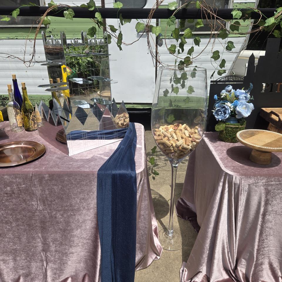 Standing tall at 4 ft and elegantly shaped like an oversized wine glass should, this display piece is perfect for wine themed weddings, vineyard celebrations, corporate tastings, and sophisticated cocktail events.  When filled with corks, florals, lights, or decorative elements, it becomes an eye catching installation that guests naturally gather around.