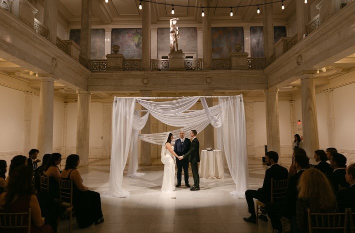 Designed exclusively for the iconic Hall of Sculpture inside the Carnegie Museum, our Hall of Sculptures Chuppah embodies timeless sophistication and modern romance. This luxury white sheer canopy features cascading drapery that softens the venue’s marble architecture, creating a breathtaking focal point for your “I do” moment.
