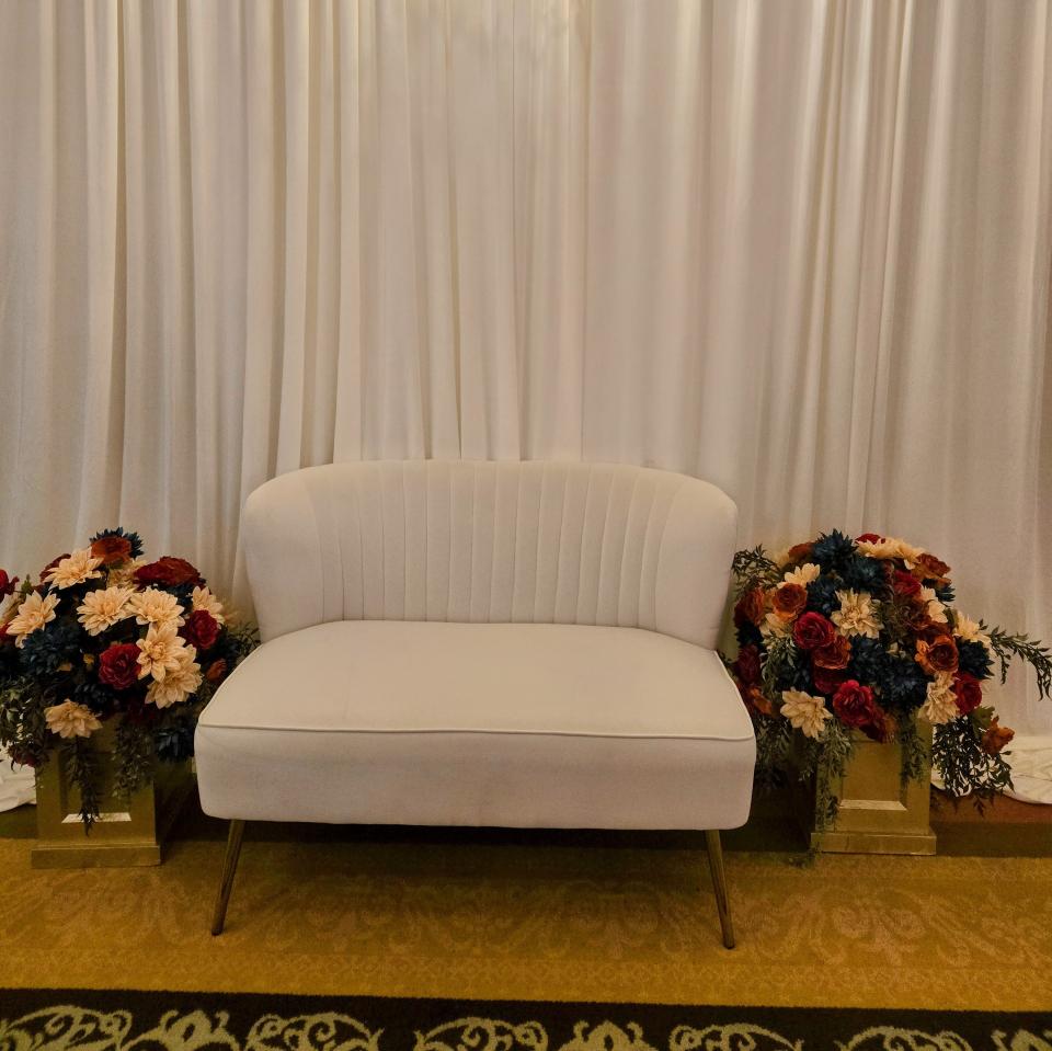 Elevate your wedding or event with our Ivory Velvet Loveseat rental in Pittsburgh. A modern romantic statement piece perfect for sweetheart tables, photo lounges, and luxury celebrations.