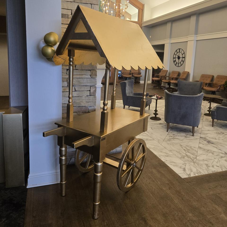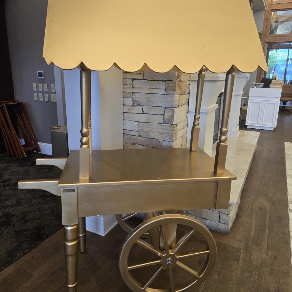Our Gold Cart is a statement-making display designed to be styled multiple ways, allowing it to transform seamlessly to match your event vision. Finished in a warm gold tone with classic wheel detailing and a charming canopy, this cart brings elegance, versatility, and strong visual impact to weddings, corporate events, showers, holiday celebrations, and brand activations. Whether styled for champagne, sweets, or coffee service, the Gold Cart becomes an inviting focal point that guests naturally gravitate toward and photographers love to capture.