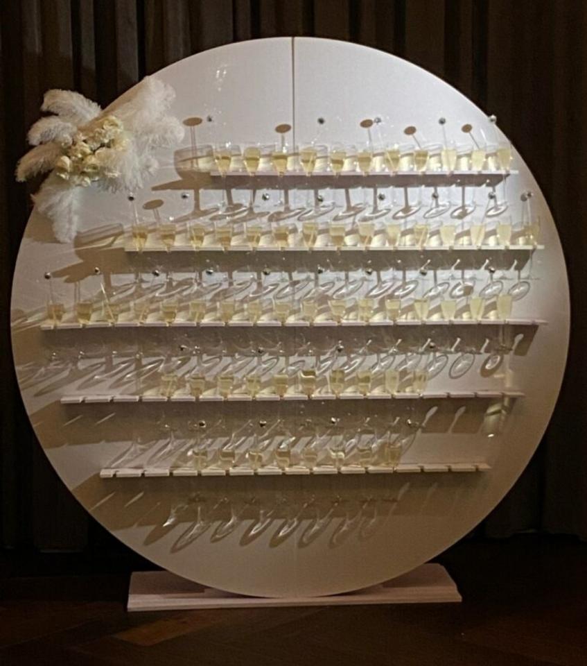 Our Round Champagne Wall is the ultimate statement piece for celebrations that demand style, sophistication, and a touch of playful glamour. Designed in a modern circular silhouette, this wall beautifully displays champagne, signature cocktails, or sparkling beverages while doubling as a high-impact decorative moment. Perfect for weddings, corporate receptions, milestone birthdays, VIP lounges, and upscale social events, it creates an unforgettable guest experience from the very first pour. Whether greeting guests at cocktail hour or offering a chic self-serve moment, this Champagne Wall is guaranteed to elevate your event with elegance and sparkle. Holds 74 champagne glasses.