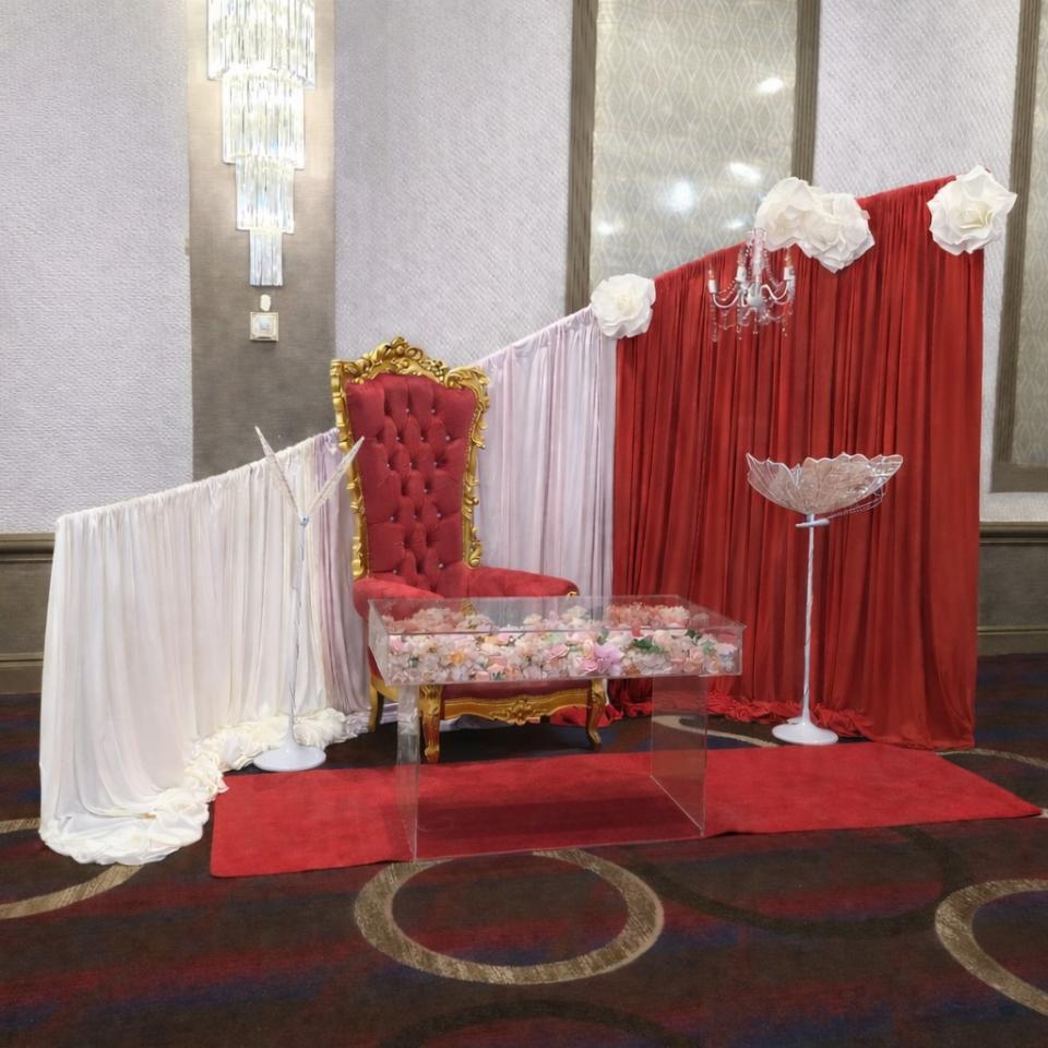 Designed to command attention the second guests walk into the room, this sculptural curved draping backdrop creates depth, drama, and a sense of old world glamour that photographs like a dream. The soft curve frames thrones, sweetheart tables, head tables, and photo moments with intention and authority, instantly elevating the space into something unforgettable.