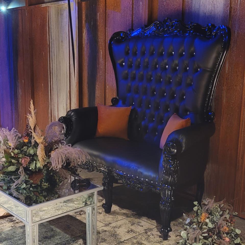 Make a bold entrance with our Black Throne Loveseat rental in Pittsburgh. Regal, dramatic, and unforgettable statement seating for weddings, proms, galas, and VIP events.