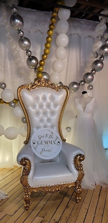 The white reflects light beautifully, creating a soft glow in photos, while the gold trim adds warmth, prestige, and ceremonial impact. This piece feels refined yet powerful, making it ideal for weddings, quinceañeras, milestone birthdays, bridal events, gala seating, and grand entrances where the guest of honor deserves more than a standard chair.